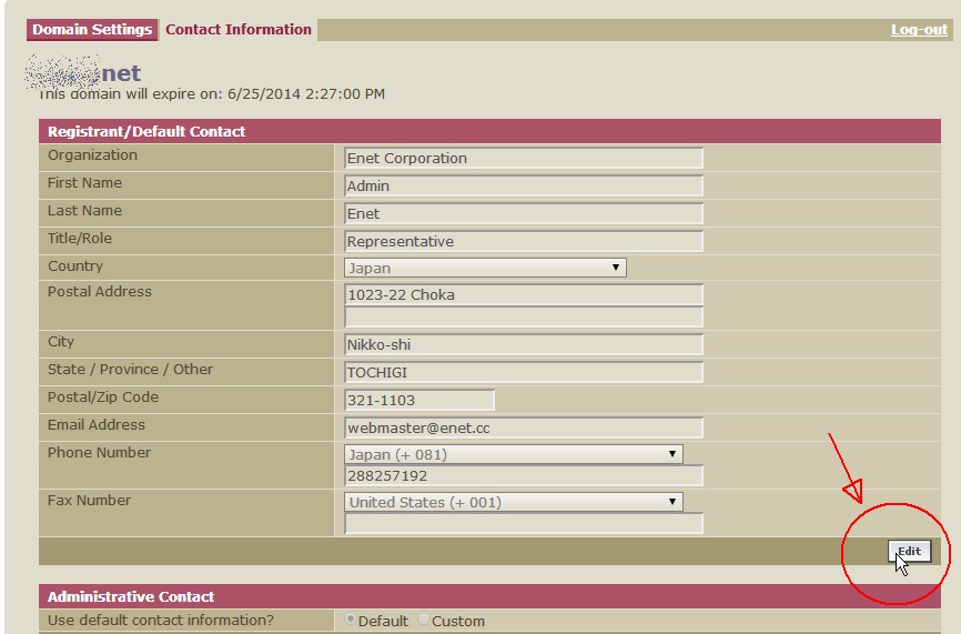 【重要】このWhois情報の厳格化処置に伴い、イーネットコーポレーションが契約しているメインレジストラであるeNomは、2014年から、Registrant(所有者)情報を「Default Contact(基本のコンタクト情報)」として、Whois情報の書き換えなどの変更事項請求があると、Registrant Contactのアドレス宛に確認メールを送信し、それに正しく応答(承認)しないと変更を認めないというルールにしました。しかし、その際に、